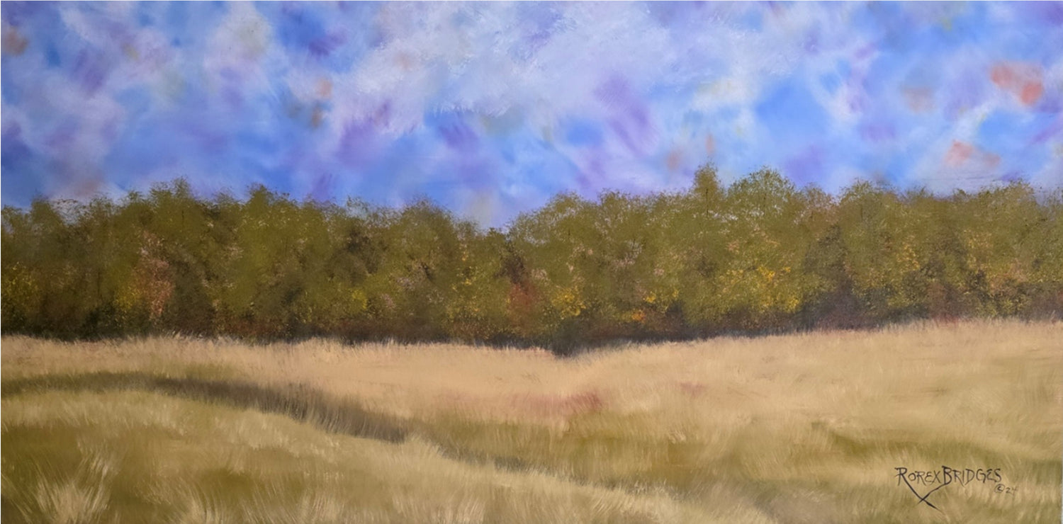 "Native Land" is an oil painting on a 48" by 24" wrapped canvas. I really enjoyed painting this because I had no plan when I started. It just came together and then I realized I had created a landscape that looks like the rolling hills of my Oklahoma.
